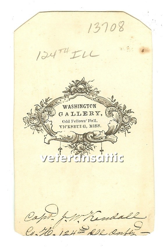 September, 1862 and was mustered out August 15, 1865. The image has a "Washington Gallery, Odd Fellows' Hall, Vicksburg, Miss." backmark. It is signed in period ink "Capt. J.W. Kendall - Co. H, 124th Ill. Infty.".
