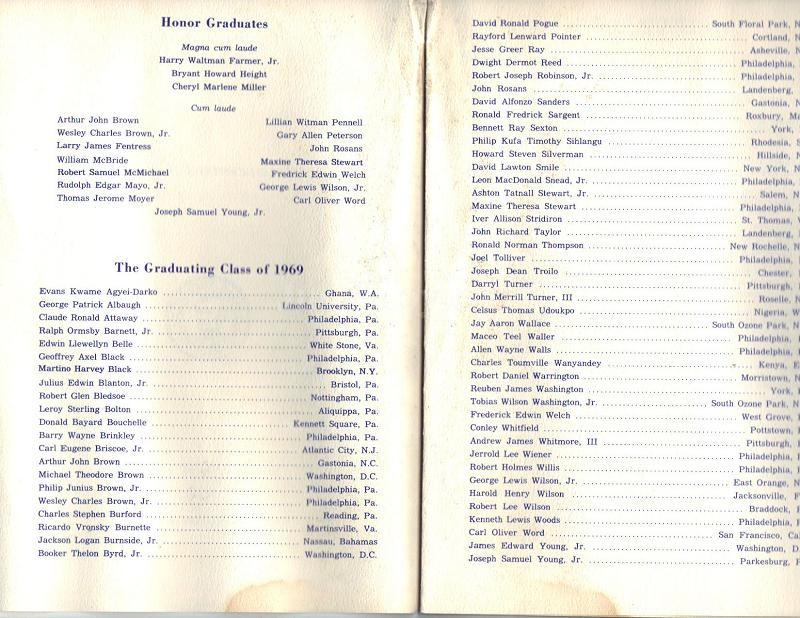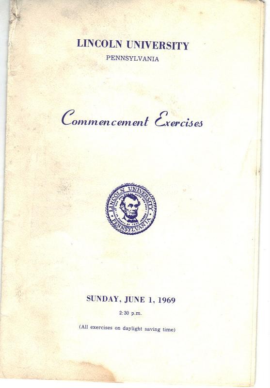 This is an original pamphlet entitled, "Lincoln University Pennsylvania Commencement Exercises" It is dated Sunday, June 1, 1969. The invocation was offered by Samuel G. Stevens. Marvin Wachtman, Joseph L. Harrison, Marshall W. Fishwick, Henry G. Cornwell, Andrew E. Murray, James B. MacRae and Bernard W. Harleston conferred degrees. Earl Warren, Chief Justice of the U.S. did the commencement Address. Dean Leroy D. Johnson presented the candidates. Carl B. Stokes, mayor of Cleveland gave the charge to the graduates and James E. Jones did the benediction.