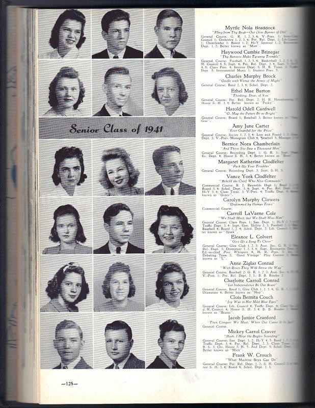 Iris Kathleen Elson Johnny Elmore Glasscoe Maxine Rebecca Harvel Erma Mae Jarvis George Bitting Jarvis, Jr. Mary Lois Jones Janedia Mae Leonard Virginia Lee Mabe Caruso Advis Miller George Clenton Peebles, Jr. Jack Edward Saylor Claudia Bunn Simpson Carrie Lee Snider John Earl Stonestreet Lawrence Gibson Taylor Era Lee Teague Edna Raye Troutman Wana Jean Welborn Rhober Monroe Wooten Martha Charlotte Leigh Arnold Hazel Virginia Baity Cleo Esther Binkley Talmadge Thomas Bodenheimer Frances Miriam Bostick Lena Trelvan Bostick Ruth Williams Bowman Myrtle Nola Braddock Haywood Cumbie Brinegar Charles Murphy Brock Ethel Mae Burton Harold Odell Cardwell Amy June Carter Bernice Nora Chamberlain Margaret Katherine Clodfelter Vance York Clodfelter Carolyn Murphy Clowers Carroll LaVarne Cole Eleanor L. Colvert Anne Ziglar Conrad Charlotte Carroll Conrad Clois Bernita Couch Jacob Junior Cranford Mickey Carroll Craver Frank W. Crouch Dorothy Grey Darnelle Alvin Clinton Davis Mildred Amelia Theresa Durie Rachel Adelaide Eddinger Ira James Ervin Richard Roscoe Foster Rudie Bell Foster Felecia Amelia Gatewood Barbara Jane Gilbert Dwight Gordon Cleo Belle Gough Hazel Marie Hall Mary Lois Hamlin David Wade Hancock Winona Mae Hauser John Vernon Hayes Margaret Elizabeth Hege Ruth Marion Hester Robert Fairfax Highsmith Sybil Carolyn Hutchins Charles R. Jones, Jr. Dorthea Jean Kellette Sara Erleen Knauff Douglas Gray Knouse Chloe Sherwood Leazer, Jr. Mildred Eloise Luck Edgar Homer Lynch Evelyn Beatrice Lyon Silas Sherman Macey Rachel Winifred March Clyde Broadus Martin, Jr. Norma Rose Martin Bill Money Mildred Louise Moorefield Charles Anderson Noell Louie Clifton Pack, Jr. Elias Jackson Parrish Hazel Ogburn Peddycord Raymond Lindsay Petree Arlene Pilcher Noah Edward Potts Lorraine Gray Price William Franklin Pulliam Johnny Arthur Rayfield Mary Juanita Rule Donna Lee Sapp LucyCaroline Seagraves Willie Frances Seal Thelma Louise Seay Margaret Mae Sharp Valeria Alice Shelton Gladys Milelr Sink Grady Calvin Sink Archel Neal Smith Barbara Lee Smith Zelma Inez Smith Hazel Marie Southern Alex A. Spach Odell Vernon Sprinkle Walter Mahlon Stamper A.D. Stewart, Jr. Dewey Harding Stonestreet Henrietta Stout Edith Mae Stovall Kamp Lee Swaim James Teague, Jr. Norma Mae Teague Theda Rae Thornton Ella Louise Threatt Juanita Lucile Varner Donald Grey Vaughn Opal Margaret Walsh Hoyt Snider Whitney Juanita Gray Williams David Louis Wilson Garland Wood Hazel Vera Wood Alice Mae Wooten Guinevere Avon Worrell Billy Yokley Seniors not pictured: This book is in good condition. At the time of this writing, we have two of these books. To purchase this book or ask for additional information, please contact George at softdsign@aol.com or 704-948-1912.